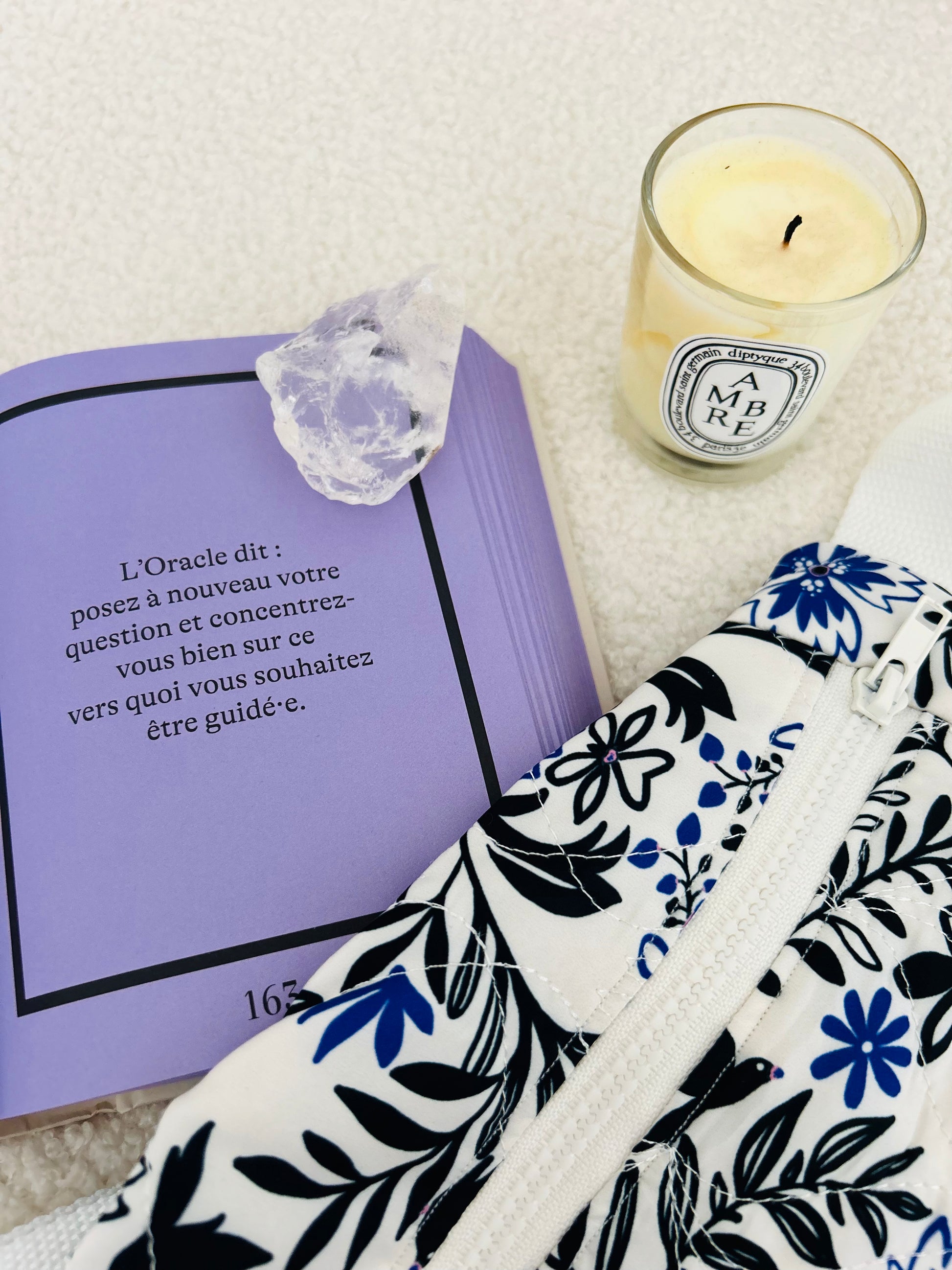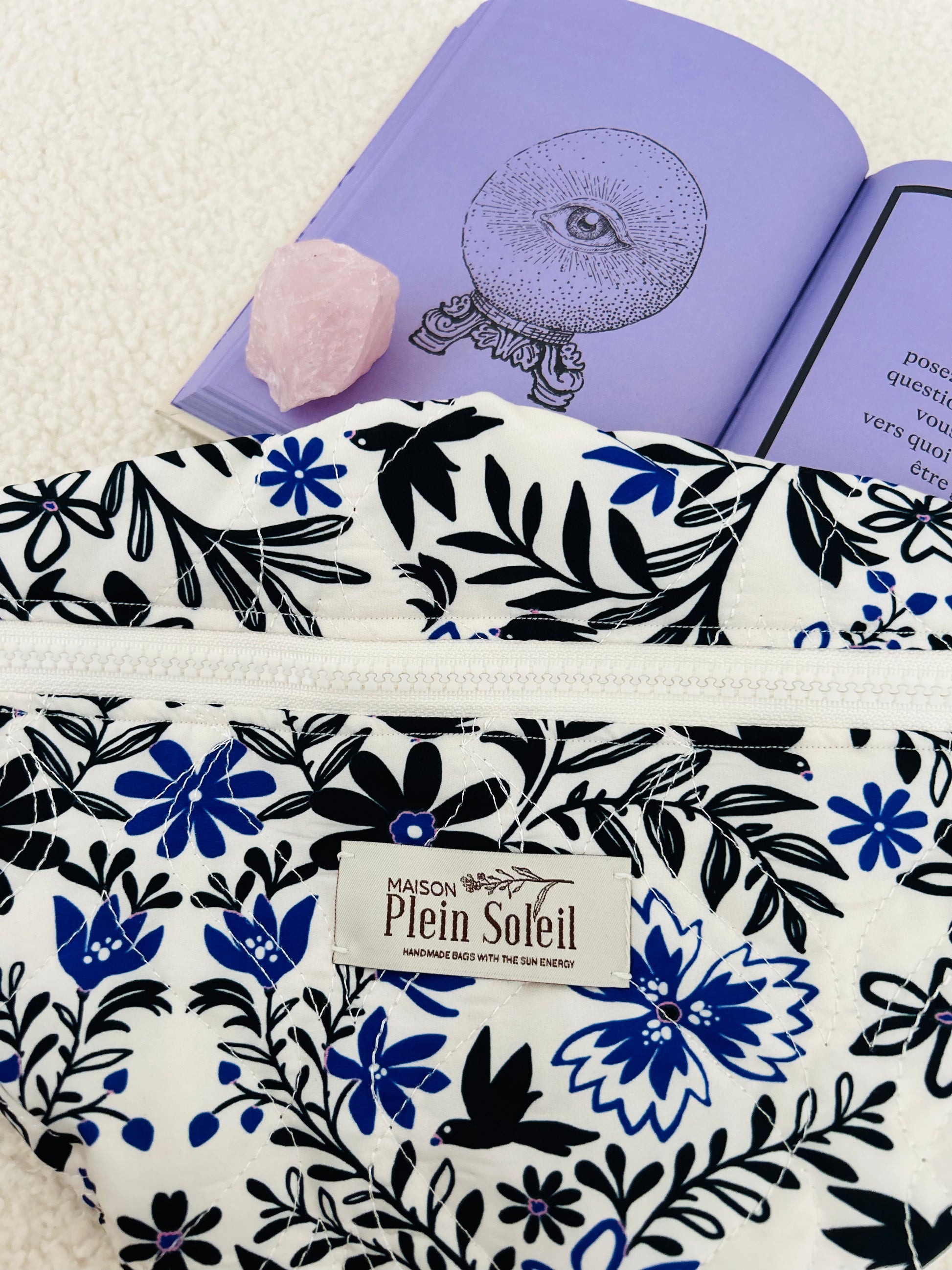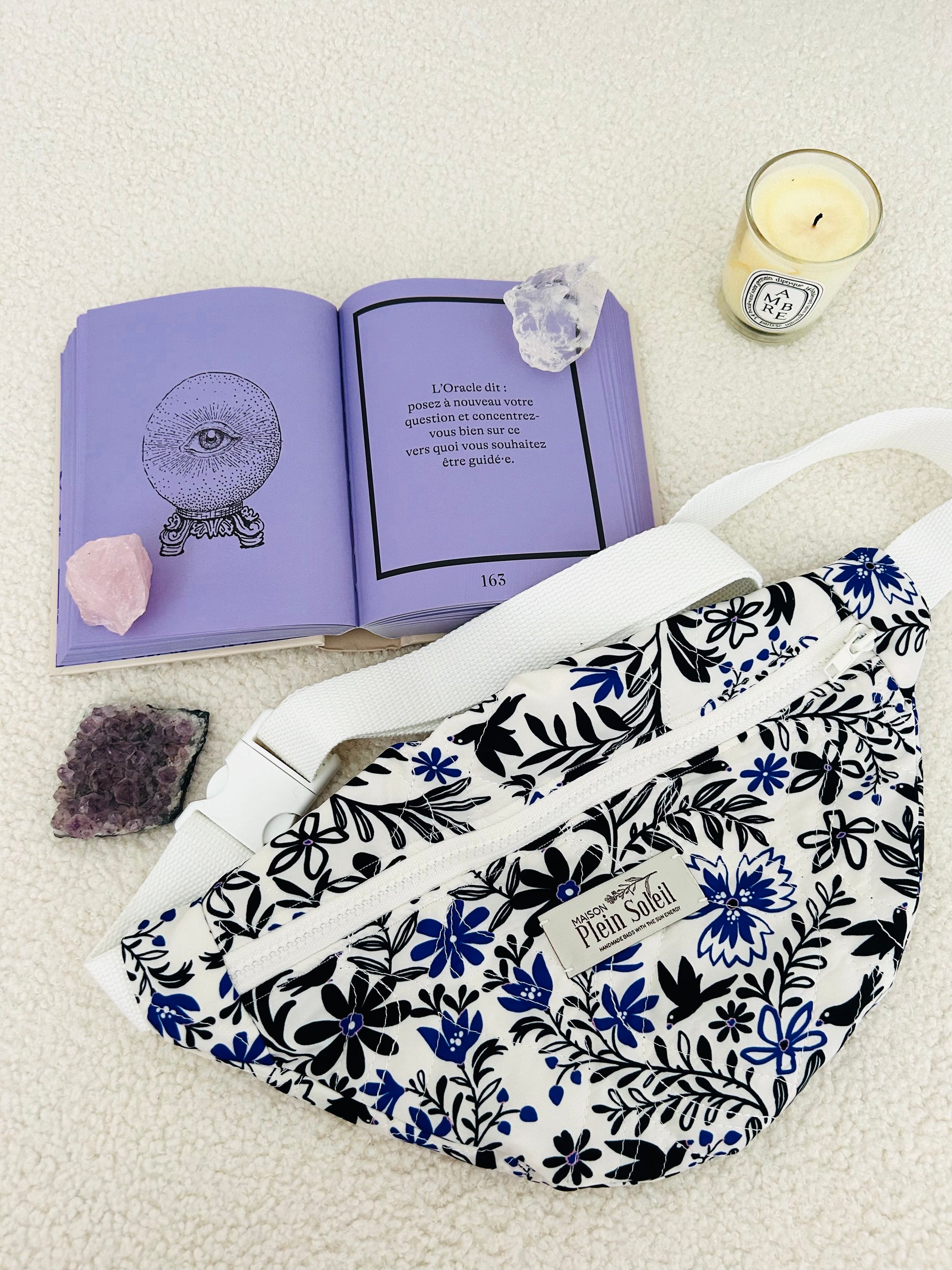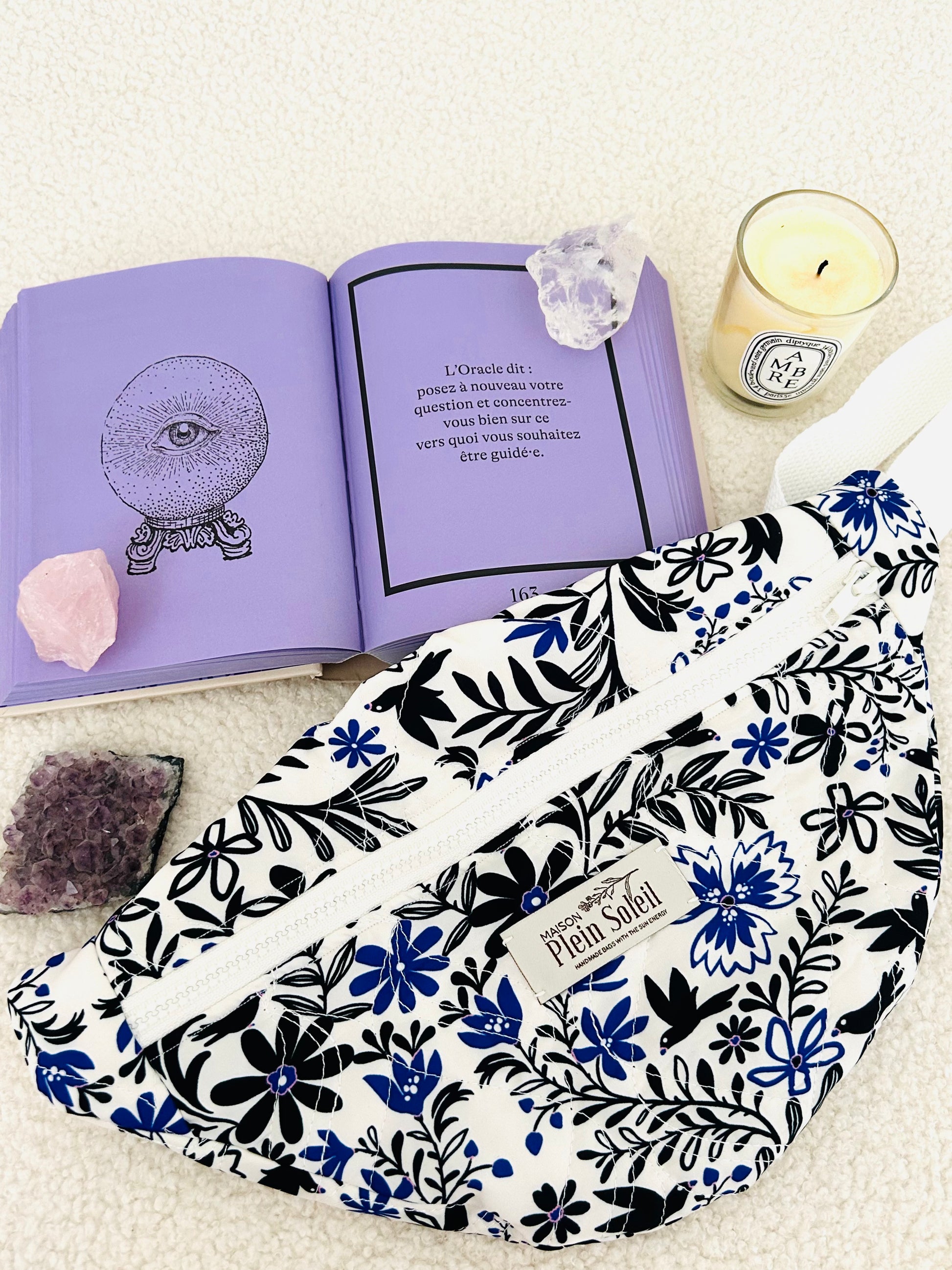 Banane matelassée blanche et motifs oiseaux noirs et bleus.
