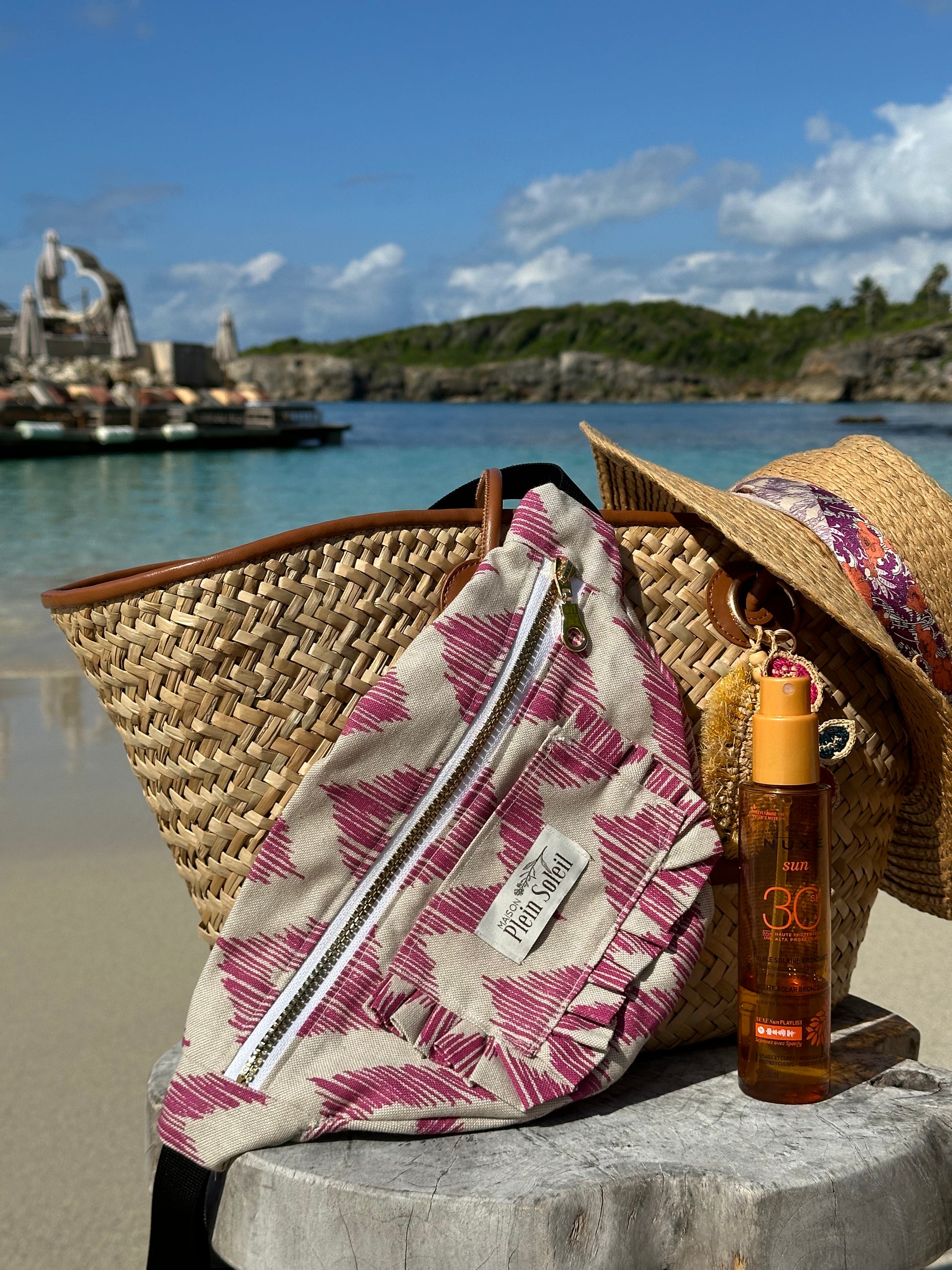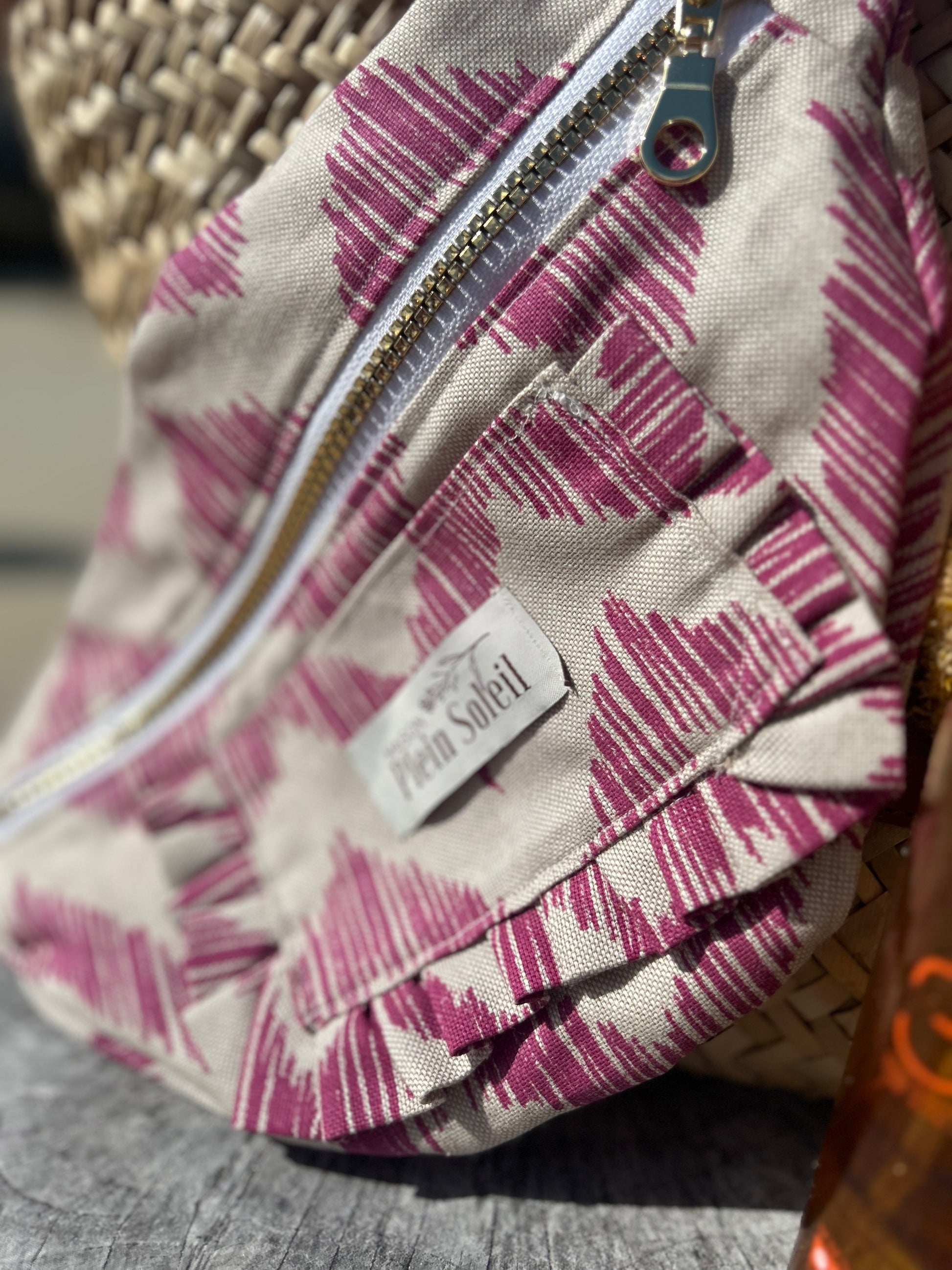 Olympe est un sac banane en lin avec chevrons roses.